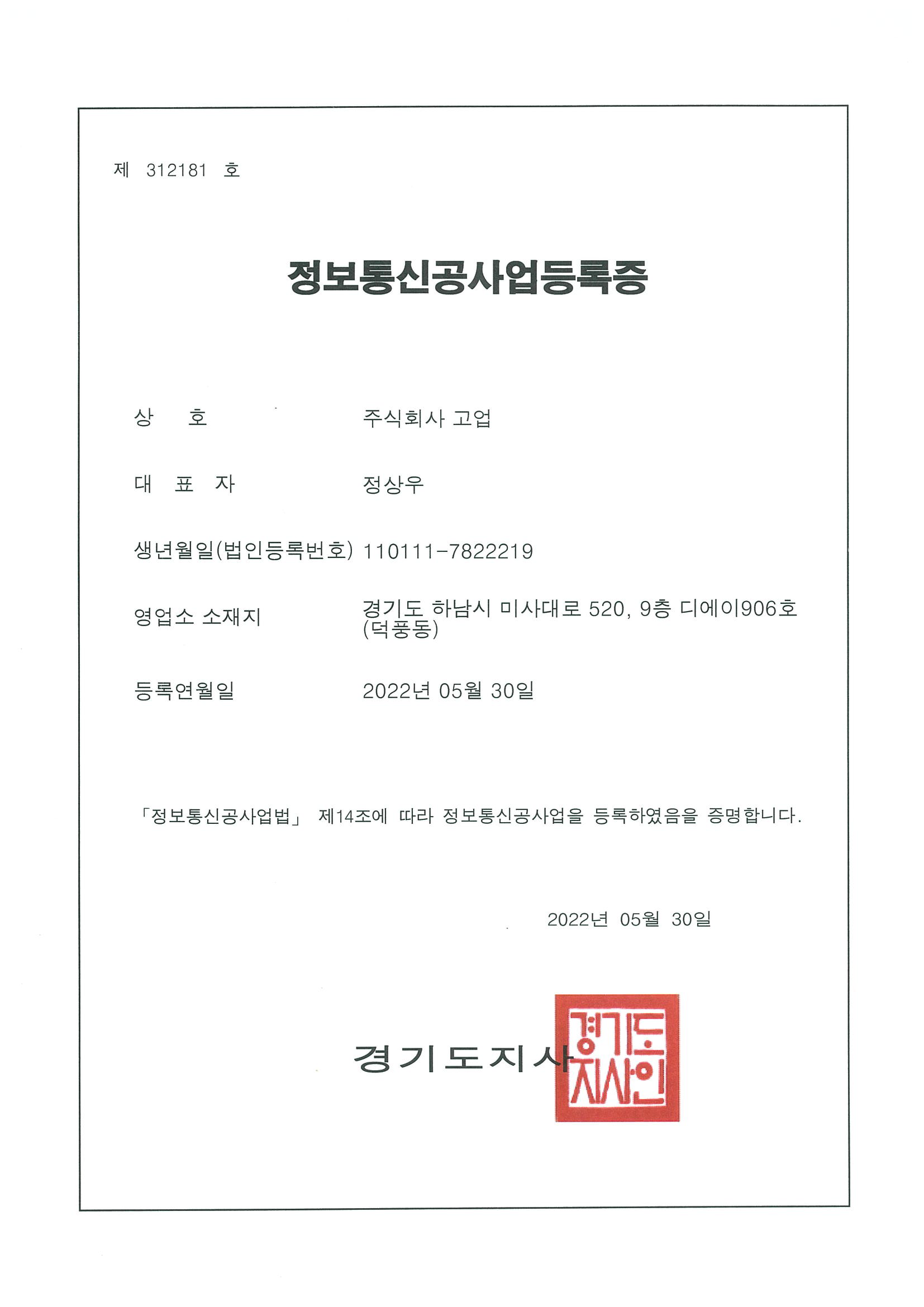 2022년 05월 30일 정보통신공사업등록을 완료하였습니다.
